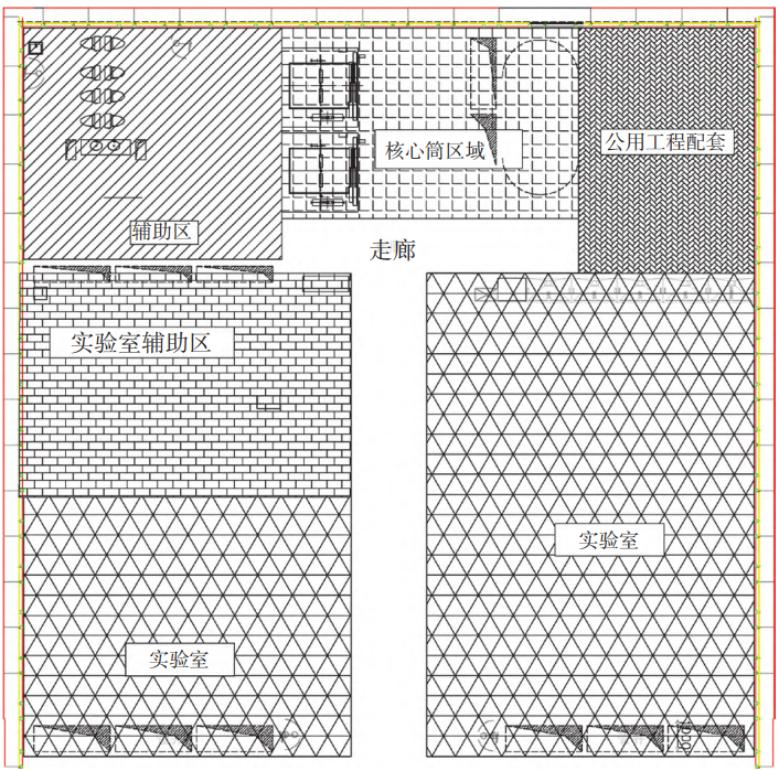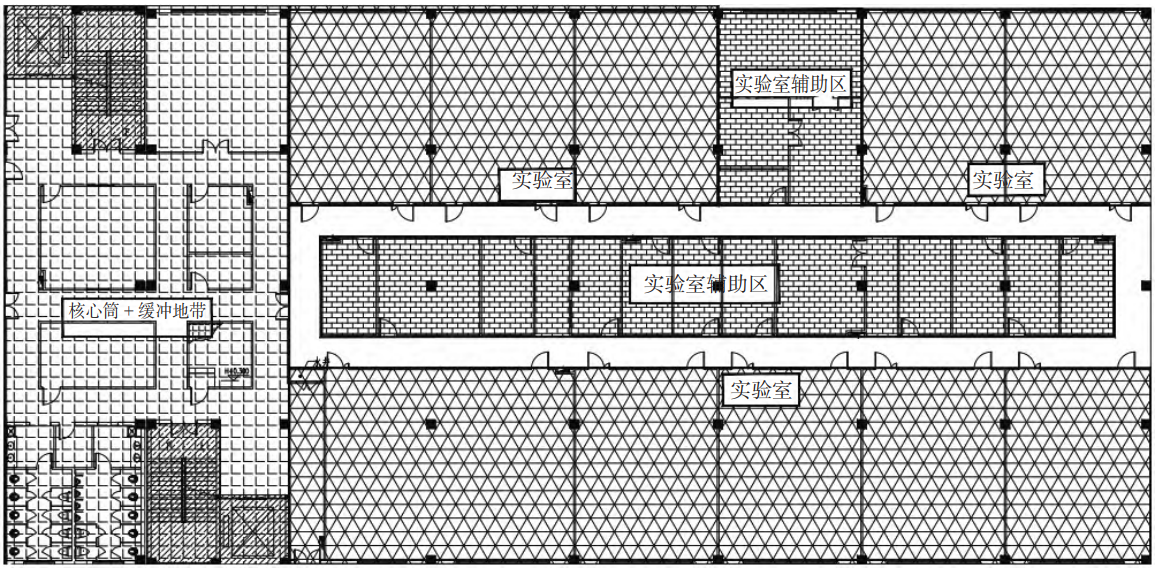 通常 CRO/CDO 企业对于一组实验室的规模会有自己的要求,诸如配制的台式通风橱数量、落地通风橱数量、实验操作人员与通风橱数量的比例等,最早回来在这类实验室内工作的海归都愿意参照国外实验室的布置设计和设备配置,而那些国内初创的 CRO/CDO 企业,基本都按行业内领军企业的配置,以减少不适配的风险,此时模块化设计也就更显出优势。根据建设方提供的 URS,再结合新建厂房或租赁厂房的土建特点,如柱间距、楼电梯等核心筒位置,进行模块化布置。可以从以下几点进行模块划分 :辅助区域,即实验操作人员办公区域、卫生间以及客梯厅等 ;公用工程区,即配电间、弱电间、气瓶间、制水间、空调机房等服务于研发实验室的公用介质配套用房 ;核心区域,即研发实验室或分析实验室。下文就将以核心筒位置、柱间距不同举例,阐述两种实验室的模块化设计。