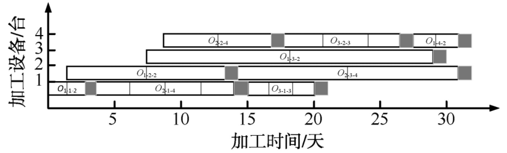 如图1所示,黑色方块代表设备清洗换型的时间,每台设备生产完一种产品后都需要进行清洗换型后才能够生产其他种类的药品。每种产品有多个批次,每个批次在一个工序生产完后即可进入下一个工序。同种药品不同批次在同一个工序不需要清洗换型。图1中,O1-1-2代表产品1在第1个工序上生产2批,其他编号依此类推。