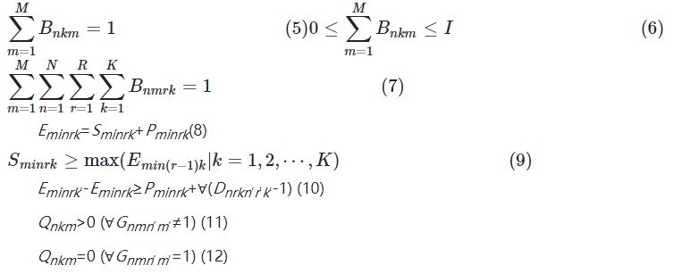 式(5)和式(6)规定了每批产品在每个工序只能分配给一个设备,允许每个设备分配0~I批产品。同时,式(7)确保每批产品只能在一台设备上生产。此外,式(8)确保每道工序加工不中断,直至工序结束。在同一工件的工序中,式(9)强调了高优先级工序的加工必须在所有高优先级工序完成后才能进行低优先级工序的加工。而式(10)表明每台设备只能同时进行一个工序的加工。最后,式(11)和(12)规定了每台设备在生产完一种产品后必须进行清洗,然后才能生产其他种类的药品,而在同一种药品的生产过程中则不需要清洗。