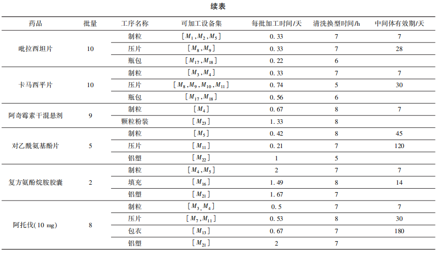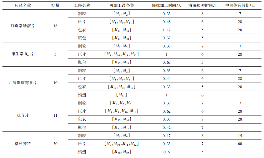 在2023年12月的生产中,总共有11种药品需要生产,其中,单个药品最大批量为30批,最小批量为2批。每种产品的工艺信息如表2所示,其中,每批加工时间根据设备产能计算得出,清洗换型时间包括设备清洁和检验时间,中间体有效期为制品临时储存的最长时间。