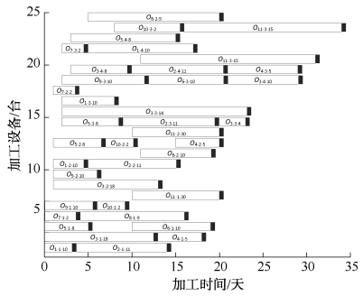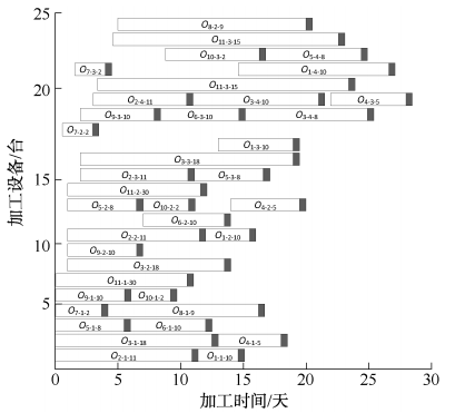 采用TOPSIS综合评价方法,对200个排产方案进行排序,发现方案93以总评分0.576居首,成为综合评价中的最佳选择。该方案最长完工时间为29天,生产平衡率为85%,设备利用率为74%。最优IMOGWO排产方案如图5所示。