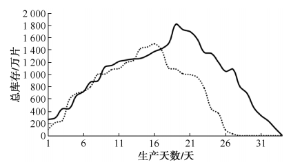 通过对比两种排产方案的中间体库存仿真模型(图6),发现基于人工经验的排产方案产生的最大库存约为1 800万片,而采用IMOGWO算法得到的最优排产方案,最大库存约为1 450万片,显示出较小的库存压力。与传统人工经验排产方案相比,IMOGWO算法生成的最优排产方案在中间体临时库存方面明显改善。