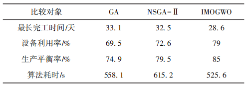对比经验排产方案,优化后的排产方案最长完工时间缩短了6天,同时,生产平衡率提高了14%,设备利用率提升了11%。结果表明:优化后的排产方案不仅缩短了生产所需时间,还提升了设备利用率和生产平衡率,从而提高了车间生产效率和产能。