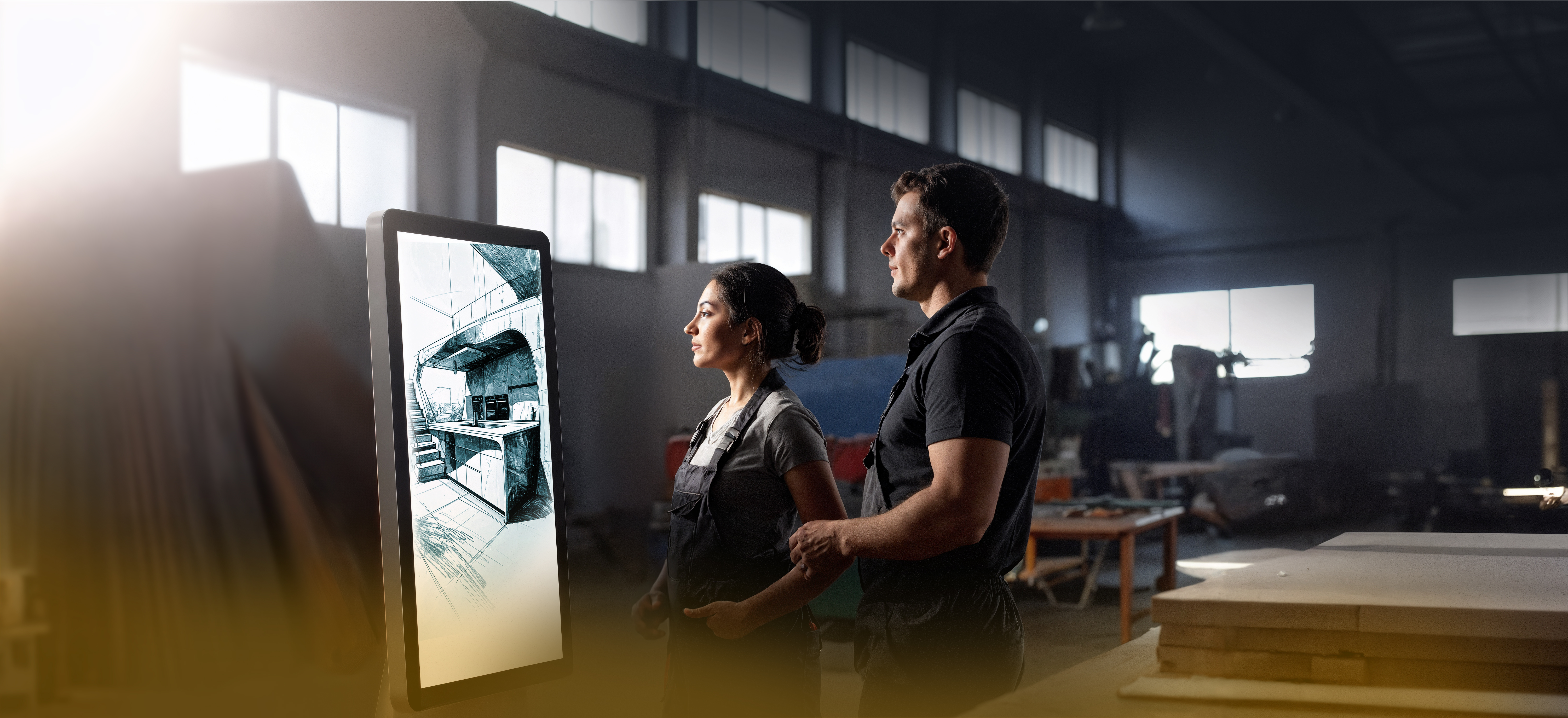 木材行业的未来愿景:一名妇女和一名男子正在观看显示现代厨房的屏幕