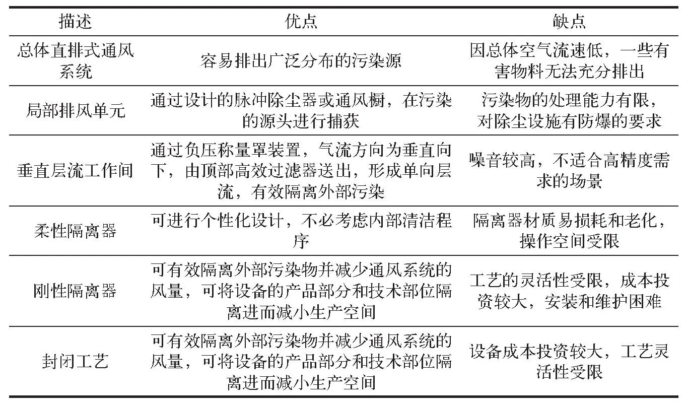 根据生产工艺进行封闭设计,使用物理隔离将危险物料隔离在人员操作区域之外。一般有柔性隔离、刚性隔离及封闭工艺。柔性隔离器设置在需要手工作业的区域,通过在设备周围设计出内置手套或传送袖口的柔性隔离器;刚性隔离器一般采用不锈钢、玻璃等刚性材质,主要用于隔离药品生产过程中的操作区域与外界环境;封闭工艺中所有的操作流程环节都是密闭的,如生产中常用的自动配料系统、无菌灌装封闭系统、连续化制粒压片系统等。