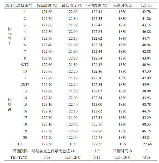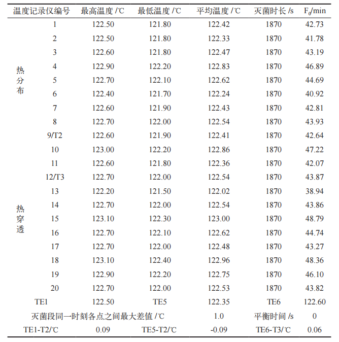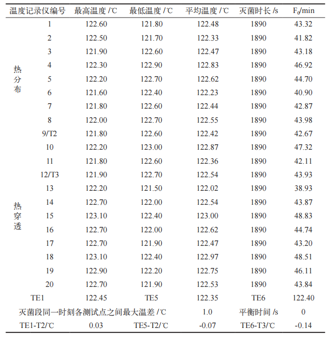 可接受标准:在灭菌阶段,灭菌腔室内各个热分布测试点的温度均应处于 121 ~ 124℃范围之内,灭菌时间≥ 1800 s ;在灭菌段同一时刻,各测试点之间的最大温差为 2℃ ;TE1、TE5 的平均温度与附近温度记录仪平均温度T2 的温差不超过 ±1℃ [6]。