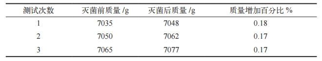 连续三批次试验负载物品干燥测试包的质量增加均< 0.2%,干燥效果良好。干燥效果实验结果见表 7。