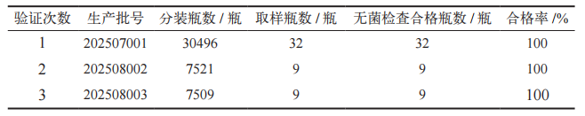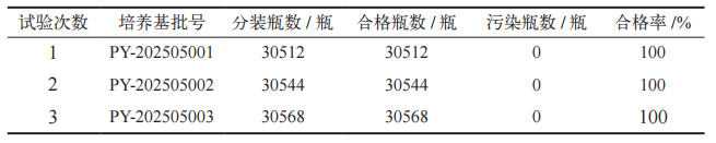 根据《无菌工艺模拟试验指南(无菌制剂)》,分装线首次验证需连续进行 3 批培养基模拟灌装试验 [11],每批设计分装量为 30500 瓶,使用 SGLHA-2000D 型蒸汽灭菌器对每批次分装用具、胶塞、铝塑组合盖进行湿热灭菌,统计合格率、污染瓶数,判定其湿热灭菌效果是否符合 GMP 的要求。