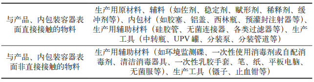 GMP 对物料有着严格的分类和管理要求。企业根据实际生产要求,将生产所需的原材料、辅料、包装材料以及生产辅助材料(包括生产区域使用的消耗品、其他辅助物品及检定用物料)等物料输入 B 级洁净区,并建立了相应的转运操作流程及文件管理制度,旨在最大程度地减少物料跨级别转运可能产生的污染风险。本文将按照物料是否与产品及内包装容器表面直接接触,对输入B 级洁净区的物料进行分类(表 1)。