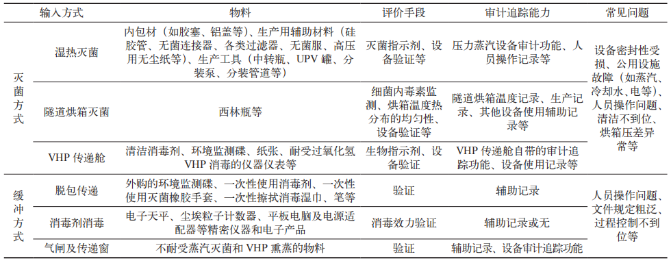 2010 版 GMP 规定,生产过程中应尽可能采取措施防止污染和交叉污染,例如设置必要的气锁间和排风系统。气锁间的设置目的是在人员或物料出入时对气流进行控制,分为人员气锁间和物料气锁间 [14]。根据 EU GMP 附录 1 的规定,对于 A 级和 B 级洁净区,通过气闸或传递舱传递的物料必须符合洁净室梯度要求 [15]。对于需要跨级别进入 B 级洁净区的物料,可以通过气锁间或物净间 /窗进入,采用气闸单侧开启的方式防止外部空气流入洁净室,风淋则利用高速(≥ 25 m/s)的洁净气流吹落物料表面上附着的尘粒 [16]。这种物料传递方式并非灭菌手段,仅作为缓冲措施,它通常与消毒剂的使用和脱包传递相结合,应用于无菌生产过程中。对于较大或设计复杂的物料(如设备、平板电脑等),难以进行全面消毒和风淋,可能存在污染引入的风险。另外,传递过程中消毒和风淋的效果高度依赖人员操作,可能出现消毒剂喷洒未完全覆盖物料外表面、作用时间不足、风淋存在盲区等问题。综上所述,本文将物料输入 B 级洁净区的方式分为灭菌和缓冲两种(见表2)。灭菌方式的微生物杀灭效果能够得到清晰的验证结果,在实际操作过程中能够实现有效的过程控制,并在审计追踪上更具优势,明显减少了人员操作的干预和风险,但对厂房的公用设施和人员设备操作的要求更高。使用缓冲方式将物料传递至 B 级区,显然更易增加污染引入的风险。然而,在别无他选的情况下,通过进行适当的风险评估,并采取有效的污染控制策略,依然可以符合GMP 标准,实现物料的合规传递。