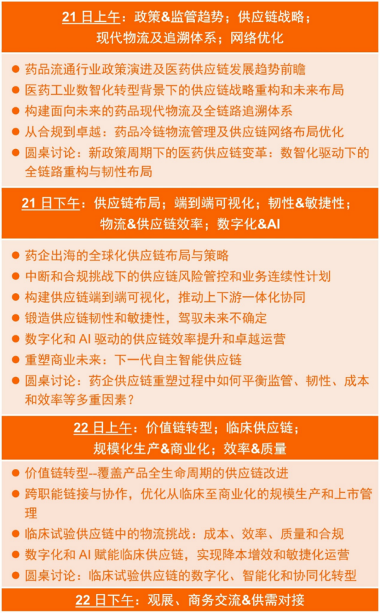2026全球医药供应链(中国)峰会将于5月21-22日在上海举办。峰会将汇聚来自政府、行业协会、药企&生物技术公司、药品流通企业、物流服务商、软件&系统、设备&包装、咨询机构等近400名参会嘉宾,聚焦“监管合规、韧性&敏捷性、成本&效率、数智转型”四大维度,深入探讨从临床试验、商业化、生产运营到流通与分销的全链条升级优化。我们将共同剖析前沿实践与未来趋势,为企业构建可持续的竞争优势提供关键洞察与行动指南。