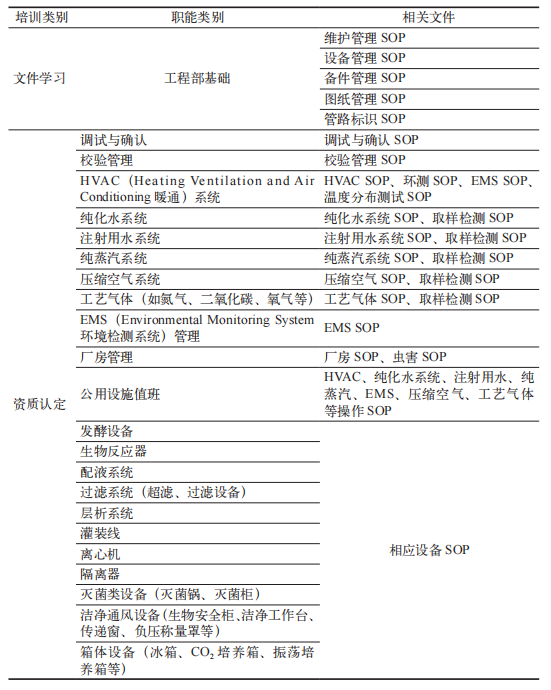 识别需求可以细分为三步,首先是建立部门的培训课程库。课程库一般包括两类,一类是文件学习,多是SOP 和相关法规文件;另一类是资质认定。以生物制药工厂的工程部为例,其培训课程库如表 1 所示(示例只含SOP 文件,实际可以包括法规文件)。