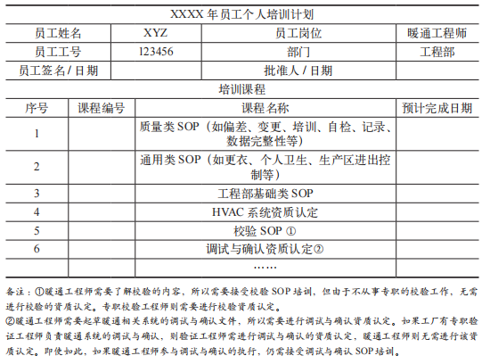表 2 某生物制药工厂工程部的暖通工程师的个人培训计划