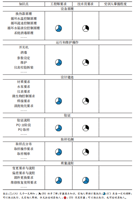 单元三:独立操作和深入学习。受训人员在培训师的指导下,独立进行纯化水系统的运行和维护操作,并通过学习法规知识和专业知识(如 ISPE水系统相关文件),深入掌握纯化水系统的知识与法规要求(此部分一般针对工程师及以上级别人员)。通过 Skill Map(技能矩阵)这一工具,仔细评估受训人对纯化水系统每个知识点的理解和掌握程度,并在掌握程度栏中填写实际掌握情况的编号。如果个别知识点未达到对应岗位的要求,必须采取额外措施(如补充讲解、演示、演练)来加强理解和掌握。如果大范围知识点不符合岗位要求,则需考虑重新培训或重新评估该受训人的胜任能力,具体信息如表 3 所示。