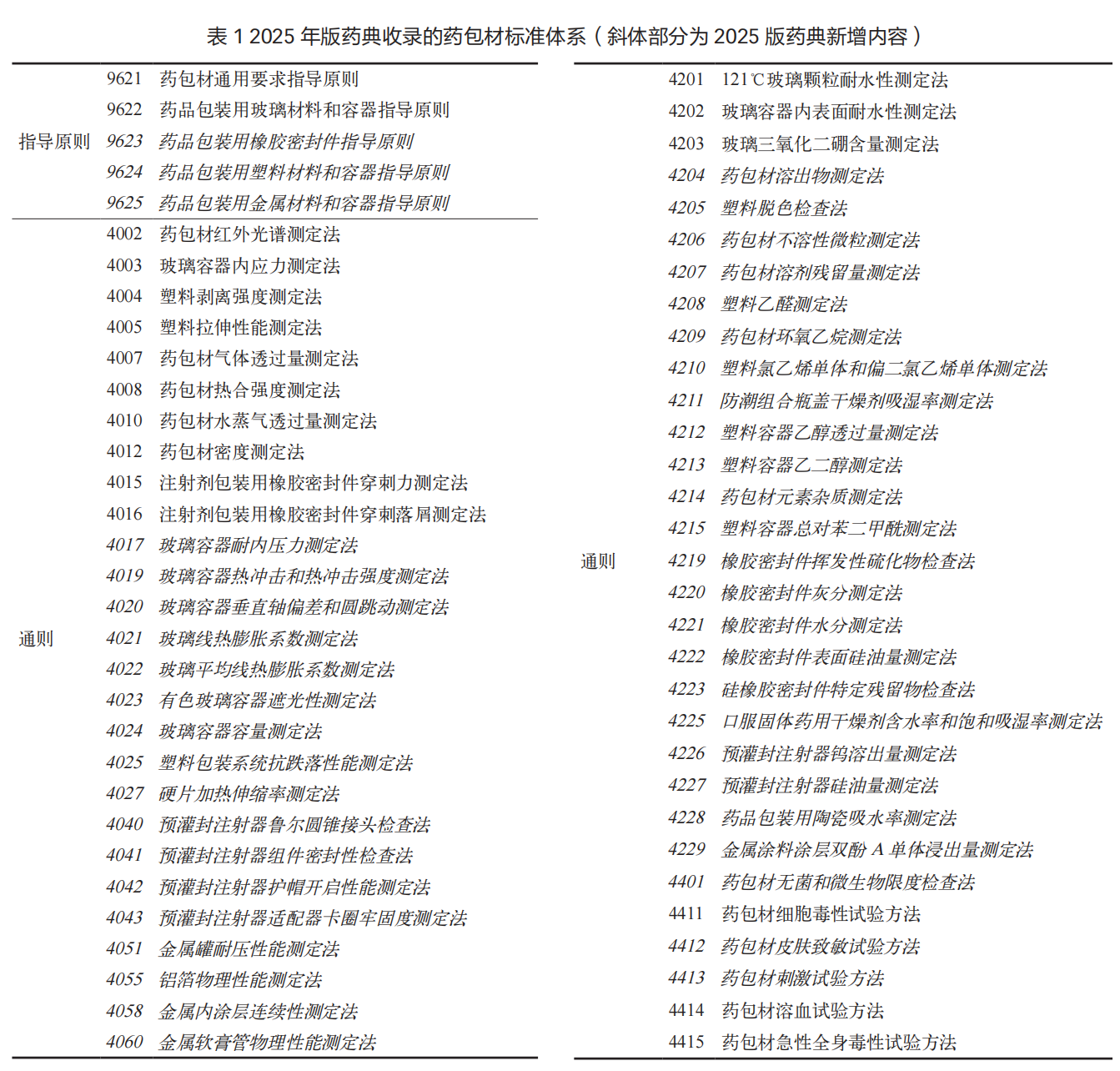 《中华人民共和国药典》2025 年版在 2015 年版药典首次收载药包材通用要求和玻璃类药包材 2 个指导原则、2020 年版药典首次收载 16 个药包材通用检测方法的基础上,形成了“1 项通用指导原则 +4 项材质指导原则 +58 项检测方法”的主要框架 [4],具体内容详见表 1。