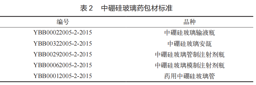 《药用玻璃成分分类及理化参数 》(YBB00342003-2015)对高硼硅玻璃、中硼硅玻璃、低硼硅玻璃和钠钙玻璃的化学组成及性能进行了规定。其中,中硼硅玻璃的成分标准为:B2O3 含 量 ≥ 8%,SiO2 含量约为75%,Na2O+K2O 含量约为 4% ~ 8%,MgO+CaO+BaO+SrO 含量约为 5%,Al2O3 含量为 2% ~ 7%,平均线热膨胀系数(20 ~ 300℃)为 3.5 ~ 6.1 10-6K-1,121℃颗粒耐水性为 1 级,98℃颗粒耐水性为 HGB1 级,耐酸性能为 1 级/100 μg/dm2,耐碱性能为 2 级。国家药包材标准(2015 年版)中对中硼硅玻璃的药包材标准详见表 2。