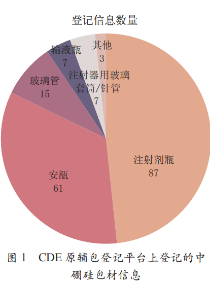 目前,在国家药品监督管理局药品审评中心(CDE)的原辅包登记信息平台上,可查询到中硼硅包材信息417 条,其中已激活的有 180 条。在这180 条已激活的包材信息中,126 条为国产包材,54 条为进口包材。其中有87 条为注射剂瓶,61 条为安瓿,15 条为玻璃管,7 条为输液瓶,7 条为注射器用玻璃套筒 / 针管,3 条为其他玻璃药包材,详见图 1。