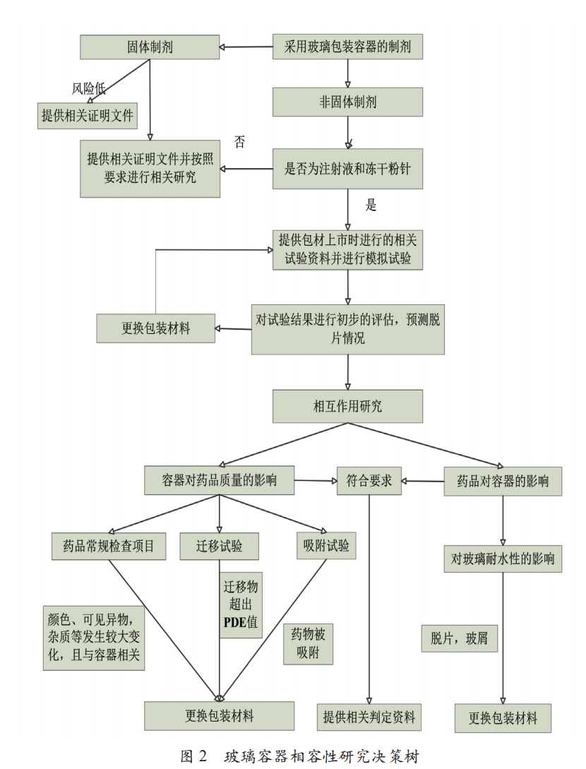 包装制剂后药物的质量变化(稳定性),包括加速试验和长期试验药品质量的变化情况。对于存在多种包装规格的注射剂应选用比表面积最大的规格。模拟溶剂的首选为对应药液,若药物对分析方法产生干扰,可经评估选择与制剂具有相同或相似理化性质的模拟溶剂。不同浓度的注射剂可参考 ICH 的括号法或矩阵法进行稳定性研究。玻璃容器相容性研究决策树见图 2。