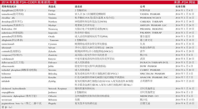 导读2014年美国FDA药品评价和研究中心(CDER)批准了41个新分子实体(NME)和生物制品许可申请(BLA)(不包括FDA生物制品评价与研究中心(CBER)批准的疫苗、血液制品等产品),高于2013年(27只)和2012年(39只)的新药数量。作为FDA批准药物丰硕的一年,其中抗肿瘤领域有9只药物获批,成为获得批准药物最多的领域。其次,4只糖尿病药物,4只新型抗菌药物,其中新型抗菌药物获得批准对该领域目前疲软的新药研发,无疑起着积极的推动作用。