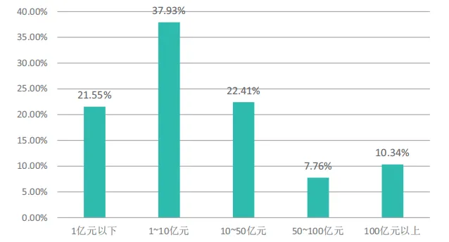 我国制药行业在人员规模和营业收入方面呈现出典型的纺锤形结构。人员方面,100 ~ 500 人企业占比最高(36.21%),营收方面,1 ~ 10 亿元企业占比达 37.93%,如图 1、图 2 所示。这种结构表明行业已形成以中型企业为主体、大型企业为引领的稳定格局。