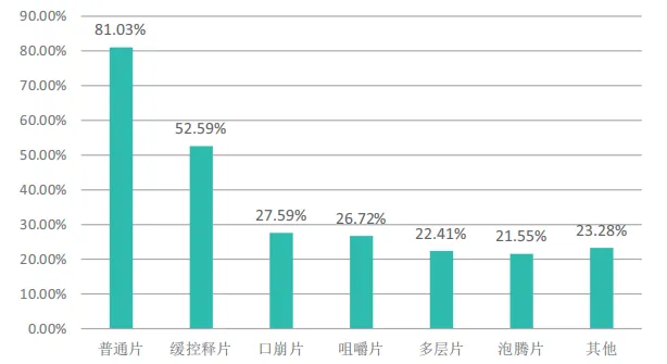 与之相应,企业主营片剂类型呈现“普通片主导、缓控释片崛起、特色剂型多元发展”的特征。如图 3 所示,普通片以 81.03% 的占比占据绝对主导,仍是大多数企业的基础产品和主要收入来源。缓控释片以 52.59% 的占比显示强劲发展势头,表明高端剂型正受到越来越多企业的重视。口崩片(27.59%)和咀嚼片(26.72%)等特色剂型获得超过 1/4 企业的生产,反映企业开始注重剂型创新和患者用药便利性。