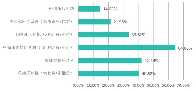 值得关注的是,连续式压片系统(21.55%)和密闭压片系统(14.66%)应用比例较低,主要集中于大型企业。尽管代表未来方向,但因设备投入高昂、工艺复杂、法规待完善等因素,大多数中小企业仍持观望态度。