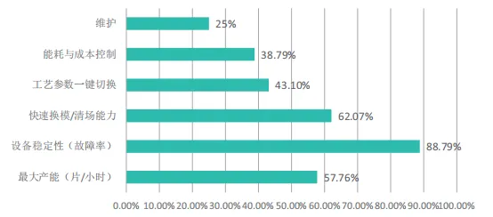 值得注意的是,最大产能(57.76%)的重要性已相对低于稳定性和灵活性,纯速度指标不再是唯一追求。同时,企业对工艺参数一键切换(43.1%)和能耗与成本控制(38.79%)有中等需求,而维护便捷性(25%)关注度较低,表明企业更倾向于从设备前期设计与性能中保障效率,而非依赖后期维护。