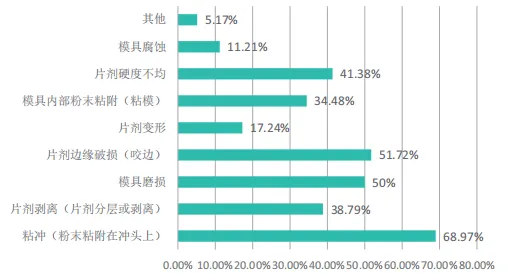 如图 7 所示,粘冲(粉末粘附冲头)以 68.97% 的选择率成为最普遍痛点,该问题不仅影响产品外观,更可能导致含量均匀度不合格,频繁引发停机清洁,严重破坏生产连续性。片剂边缘破损(51.72%)与模具磨损(50%)分别位列第二和第三,反映出模具的耐用性、结构设计和材质选择仍是企业关注的重点。边缘破损直接推高产品报废率,同时也提示冲模配合或压力参数存在优化空间。片剂硬度不均(41.38%)与片剂剥离(38.79%)也占有相当比例,这些问题通常与物料特性、模具设计以及压片工艺参数设置密切相关。