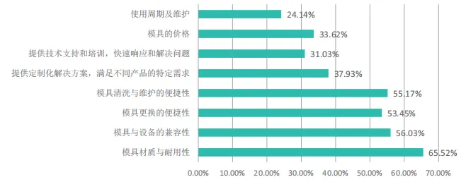 值得注意的是,模具的价格仅占33.62%,排名相对靠后,说明多数企业更愿意为性能可靠、维护简便的模具支付溢价,而非单纯追求采购成本最低。同时,企业对定制化解决方案(37.93%)和技术支持与培训(31.03%)也有一定需求,体现出在复杂制剂生产中对供应商综合服务能力的要求正在提升。