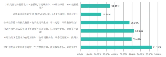 如图 9 所示,对压片设备而言,实时监控与智能化质量管控(82.76%)成为企业最迫切的需求。企业期望通过实时监测冲头压力、片重厚度等关键参数,结合 AI 视觉检测片剂外观缺陷,实现产品质量的一致性控制与异常预警,最大限度减少不合格品的产生。预测性维护与远程管理(62.07%)直接针对压片机主机、冲模系统及传动机构的故障痛点,希望通过振动分析、温度监测等手段预测关键部件寿命,降低非计划停机风险,保障生产连续性。AI 驱动的工艺优化与自适应控制(59.48%)则旨在解决压片工艺长期依赖经验的瓶颈,通过机器学习算法自动优化填充深度、压轮压力等参数,提升产品良率与生产效率,减少对操作人员技能的依赖。
