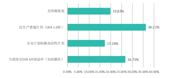 如图 10 所示,企业在相关产能布局方面呈现显著结构性分化。数据显示,仅生产普通片剂(OEB 1-3 级)的企业占比最高(36.21%),表明大部分企业仍集中于传统片剂领域。与此同时,已布局 OEB 4/5 级高活性品种(如抗癌药)的企业占 26.72%,反映出超过四分之一的企业正积极拓展这一高端市场。