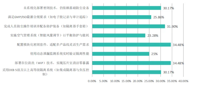 人员防尘操作培训与防护装备配置获得 31.9% 企业的投入,OEB 5 级及以上高等级隔离系统也有 30.17%企业部署,体现出对人员安全和工程防护的重视。但值得注意的是,仍有30.17% 的企业依赖基础防尘设备,未系统化部署密闭技术,显示出行业内防护水平存在显著差异。