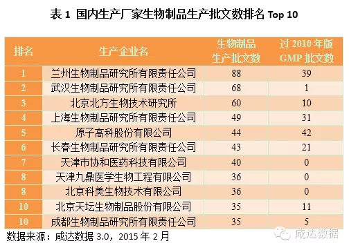 截止至2015年2月2日,我国的生物制品共有批文国内1889条,占目前国内数据库168977条的1.12%。进口445条,共有2334条批文。如表1所示,从生产批文数来看,排名前10位中,属于地方生物制品研究所的有5家。兰州生物制品研究所的批文数最多,81条;其次是武汉生物制品研究所,68条;北京北方生物技术研究所排第三,共60条。