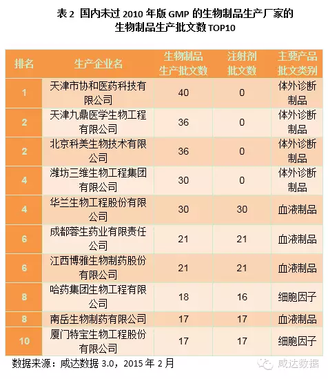 截止于2015年2月2日,咸达数据3.0监测的数据显示,超过三分之一的生物制品生产批文(总批文数1889条)未过新版GMP(2010年)。其中,超过四分之一的疫苗类批文(总批文数327条)未过新版GMP(2010年),超过一半的血液制品(总批文数409条)批文未过新版GMP(2010年)。