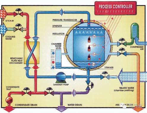 同样不采用脉动真空。使用注入机内的纯水或注射用水经特殊设计的密布在灭菌器内的喷淋系统经加压加热或冷却为产品加热或冷却,以完成灭菌过程。反压控制与上述蒸汽+空气混合式的相同。(如图 3)