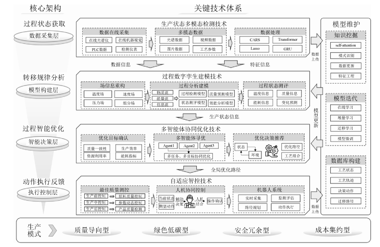 首先需要针对每个目标分析辨识相关的影响因素(人机料法环等),并建立检测方法收集尽可能全的过程数据,基于数据结合制药过程中的动量、能量、质量传递规律建立过程模型,基于系统分析得到生产过程中的物质流、能量流、信息流、控制流图。最后需要综合多重目标要求,通过数据驱动与知识驱动相结合的方式,对中药制药全过程进行动态调优。该模式通过结合AI、数字孪生、多智能体等技术形成自适应、自学习、自优化的系统化生产体系,以制药工程学原理为基础,整合AI与先进制造技术,通过以下5个维度实现生产体系的重构。①对影响产品质量、能耗、安全效率等关键指标的参数进行辨识,通过物联网及多模态技术实现对生产状态端到端的数字化映射,并经数据预处理与特征工程保障数据质量。依托工业物联网(IIoT)架构搭建分布式检测网络,部署包含光谱传感器阵列、机器视觉检测单元、智能流量计等在内的多模态检测终端。②基于制药工程规律与实验数据建立多尺度数字孪生模型,实时重构与预测工艺状态。根据制药过程系统工程理论,构建“单元操作-工艺阶段-生产批次”三级建模架构。例如,在动量传递维度建立提取罐多相流CFD模型,能量传递层面开发浓缩工序热力学仿真系统,质量传递方向构建干燥过程水分迁移预测算法。引入数字孪生技术,通过机理模型与数据驱动模型的混合建模方法,实现实际生产系统与虚拟系统的双向映射与实时交互。③以工艺知识蒸馏算法将专家经验结构化、量化为决策规则。通过工艺知识明确中药制药领域各工序及生产阶段的知识实体、属性与相互关系,同时将专家经验提炼为低维的规则与模型,建立知识的迭代优化机制。④在设备级与车间级多智能体协同框架内,运用深度学习和多目标优化算法对工艺参数和排产进行全局协同优化,采用多智能体深度强化学习算法实现动态决策优化,并结合帕累托前沿分析寻求质量、能耗、安全与效率的最优平衡解。⑤借助AI机器人与自适应控制系统将决策指令闭环执行,并在异常情形下引入人机协同校正,保证系统鲁棒与长期稳定性。基于上述研究流程最终形成“检测-建模-决策-执行”闭环的中药最佳生产模式。