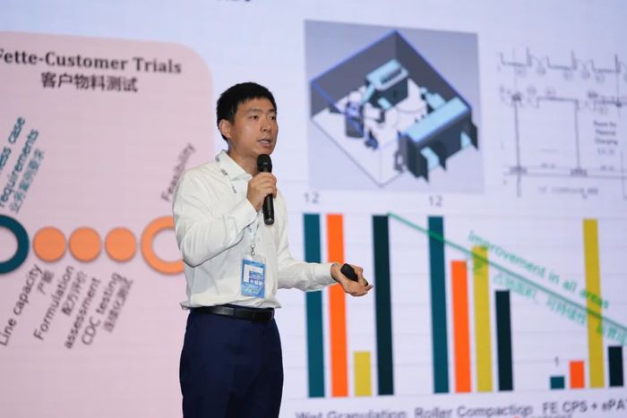 菲特(中国)制药科技有限公司能力中心技术经理朱正辉分享了从研发到生产的全生命周期片剂工艺一体化技术方案,重点介绍了公司在研发阶段创新的粉末分析仪技术,仅需2g物料即可对物料的多种性质进行充分研究;在生产放大阶段,菲特还有不同型号的设备,以满足客户相应产能的需求。同时,菲特自建有物料特征数据库,可以结合设备关键工艺参数,对同类型物料进行推测,以减少项目开发中的风险,为制药企业提供了从研发到生产的全流程解决方案。