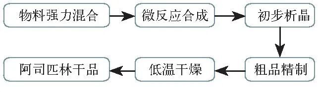 实施案例2,催化剂选择磷酸与氨基磺酸混合物,水杨酸投料以1 400 kg(10.136 kmol)计算;乙酸酐投入乙酸酐1 006 L(折合1 087 kg,10.643kmol),无水磷酸投入10.5 kg(0.1069 kmol),干燥氨基磺酸12 kg(0.1225 kmol);接下来按照实施案例1的操作方法,启动搅拌,控制温度35℃±,使乙酸酐、水杨酸、磷酸和氨基磺酸充分混合溶清或接近溶清;物料混合液匀速通过料液过滤器进入微通道反应器A区,控制压力0.3~0.4 MPa,控制连续流反应温度50~55℃;微反应料液在A区停留时间60~90 s后端口背压阀按照程序设计自动打开,反应液进入微通道反应器B区,控制压力0.2~3 MPa,控制连续流反应温度55~60℃;微反应料液在A区停留时间60~70 s,B区端口背压阀按照程序设计自动打开,反应液进入反应液中转釜;根据在线检测数据决定反应液转移至下工序降温,进行结晶和重结晶操作。