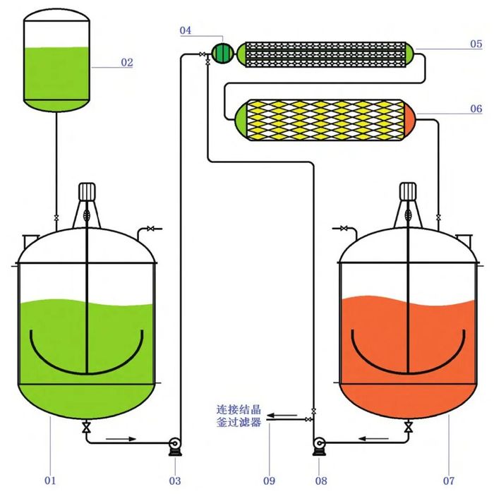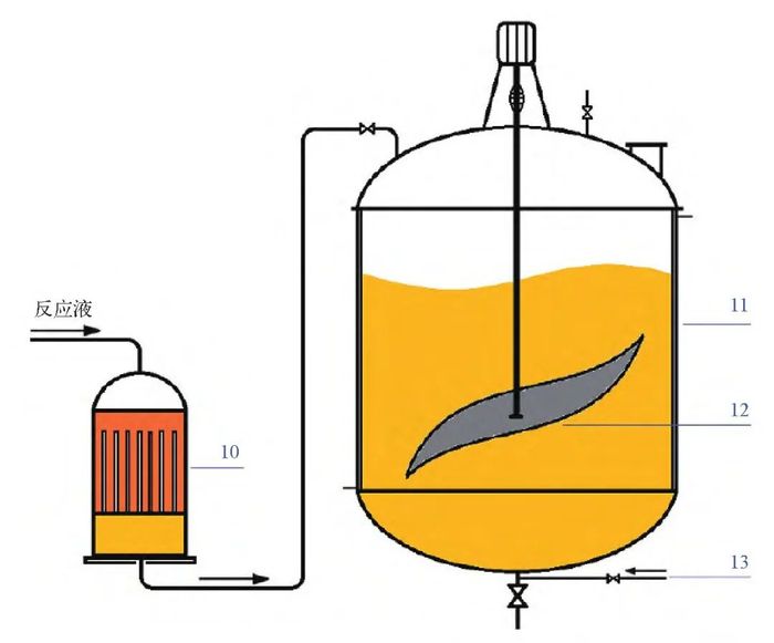10-微孔膜过滤器;11-重结晶釜;12-扭梭形桨叶;13-氮气导管
