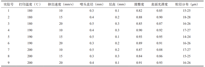 首先,计算各因素在不同水平下的均值和极差。以圆整度为例,打印温度在 180℃、190℃、200℃水平下的均值分别为(0.82+0.88+0.85)/3=0.85、(0.90+0.93+0.89)/3=0.91、(0.87+0.84+0.91)/3=0.87,极差为 0.91-0.85=0.06。同理计算挤出速度、喷头直径和层高因素的均值与极差。由此可知,喷头直径是影响微丸成型质量的关键因素。结合各因素不同水平下的均值,圆整度最高均值对应的参数组合为打印温度 190℃、挤出速度 15 mm/s、喷头直径 0.4 mm、层高 0.1 mm ;表面光滑度最高均值对应的组合与之相同;粒径分布在该组合下也表现良好。因此,确定最佳工艺参数组合为打印温度 190℃,挤出速度 15 mm/s,喷头直径 0.4 mm,层高 0.1 mm。为验证该组合的合理性,进行验证实验。结果显示,在此参数下制备的微丸圆整度、表面光滑度和粒径分布均优于正交实验中的其他组,证明了该工艺参数组合的可靠性与有效性。