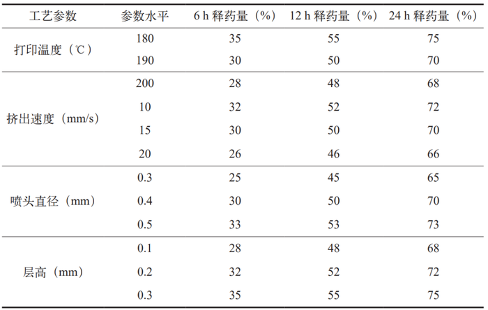 基于优化的工艺参数,本研究探讨了不同打印温度、挤出速度、喷头直径、层高对缓控释微丸释药行为的影响。详细结果请参见表 2。