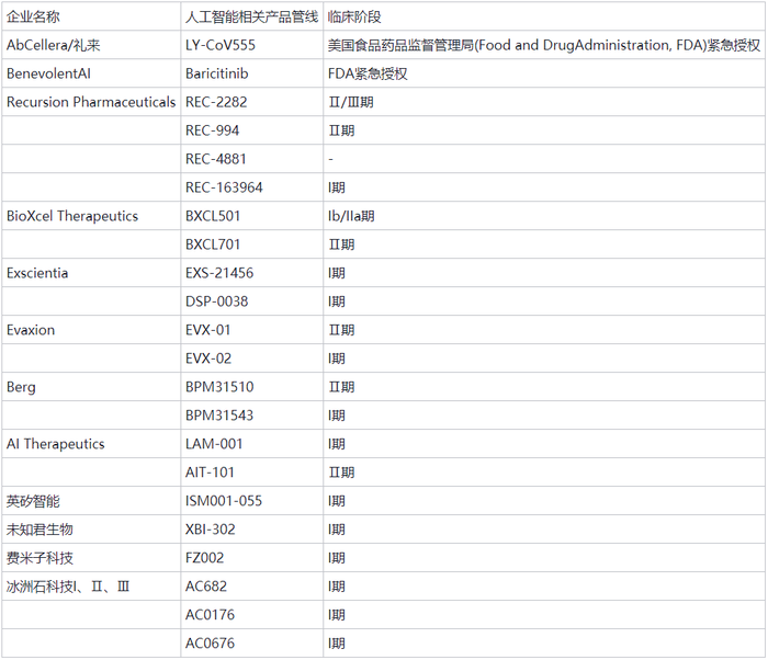 表2 部分人工智能制药临床阶段管线(截至2023年)