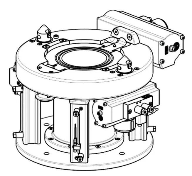 主动阀构成对接系统的基础结构,包含密封阀座、密封件及半阀瓣组件。主动法兰上的两个卡口锁紧销确保与被动阀的精准对中。所有驱动装置均配备限位开关,用于状态监测及流程自动化控制。对接与脱离过程通过气动缸驱动主动阀伸缩完成,直接固定于底板的波纹管随气缸运动同步伸缩。