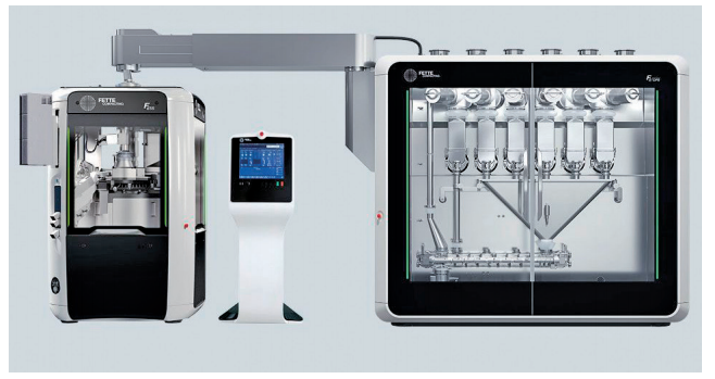 与配备三压站设计的 FE55 旋转式压片机联用优势显著:更低压制压力下延长保压时间,实现配方温和处理。整套设备可单层布局集成至现有厂房,最大限度降低基建投入(见图 2)。
