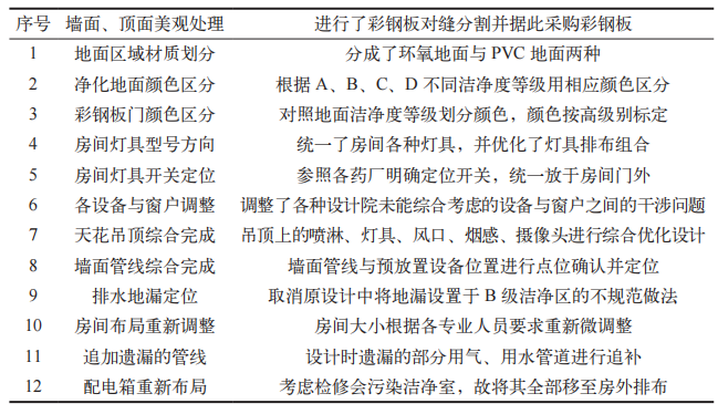 对于模型显示各类设计缺陷,尽量当场进行修改并审核确认,如此反复迭代,直至最终设计变更综合后列出所有与原设计不同的变更项,供各方签字确认,从而获得真正用于施工的设计模型。表 1 所示为综合审图分析出的设计缺陷变更列表,可见设计缺陷均能清晰辨识。