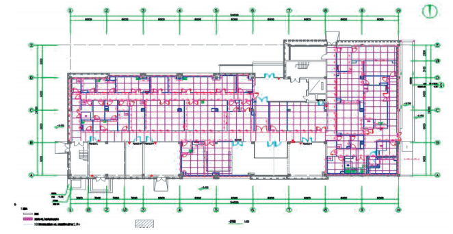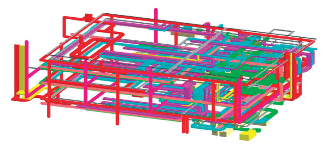 欧特克公司推出的 Revit 软件能很好地导入设计院的 CAD 图纸并进行高精度建模,且具备对翻模好的管线做碰撞检测功能。若因操作或设备原因导致吊顶高度与管线冲突,可进行局部管线排布调整,最终调整好的管线综合模型可作为施工参考模型,这对于吊顶高度紧张或排管合理性审核极为有效。使用该软件建立的模型如图 5 所示。