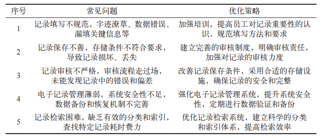 某胶囊用牛骨明胶生产企业,员工起初用铅笔填写记录,这种方式极易被擦除;随后改用蓝色圆珠笔填写,但时间一长,记录容易褪色;接着又换成黑色中性笔填写,然而原始记录却被客户误认为是复印件,于是又改为用蓝色中性笔填写。该胶囊用牛骨明胶生产企业的批生产记录经常面临挑战。记录管理的常见问题与优化策略详见表 1