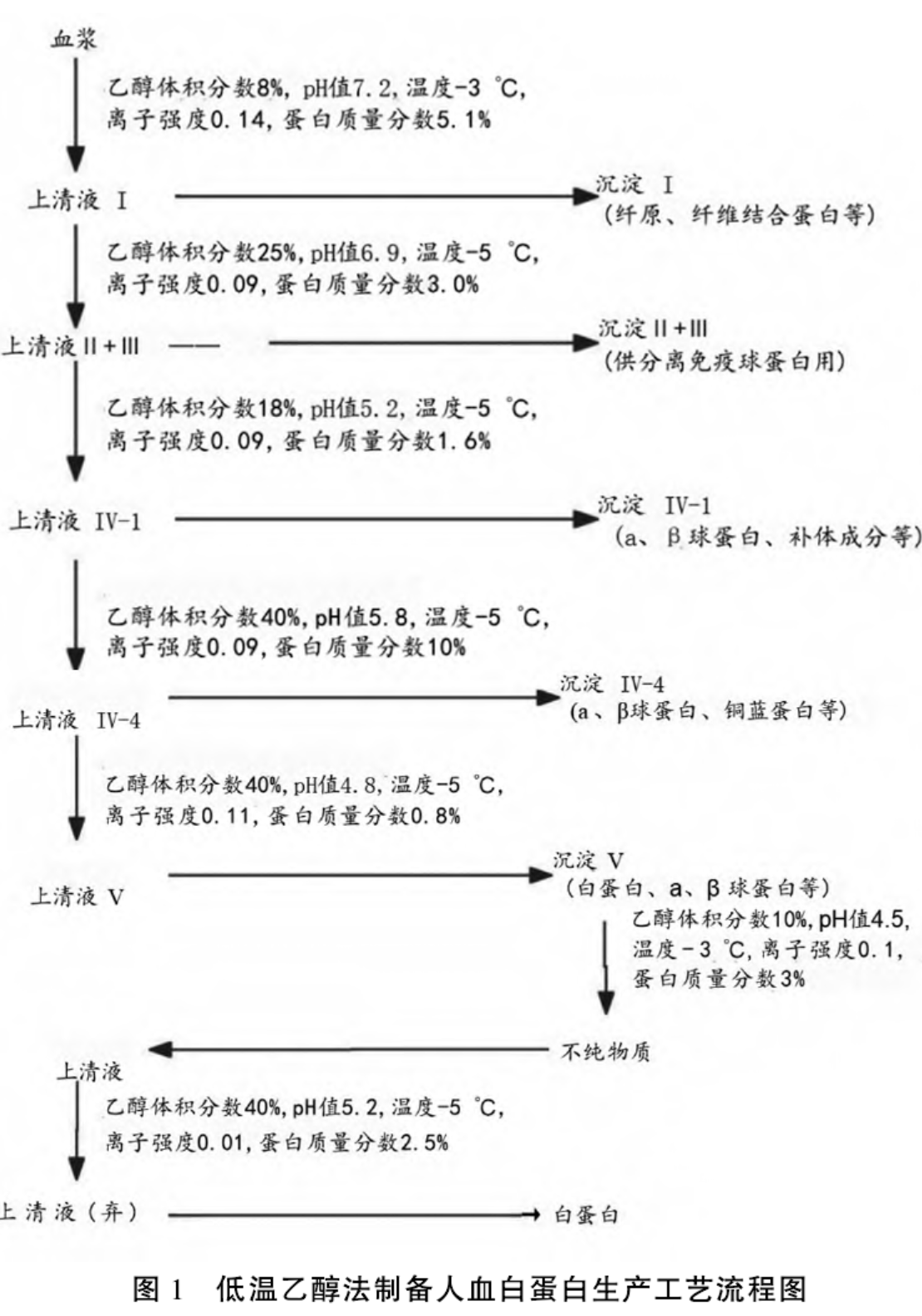 临床上应用的人血白蛋白是由健康人血浆经低温乙醇蛋白分离法分离纯化[3],并经巴氏灭活法灭活病毒后制成,下面重点介绍低温乙醇蛋白分离法制备人血白蛋白的工艺。低温乙醇蛋白分离法是以人血浆为起始原料,在逐步提高血浆中乙醇体积分数(8%→40%)的同时,提高血浆的酸度(pH值7.2→pH值4.0)、降低温度(-3 ℃ →-5℃ )并同步调节血浆的离子强度,低温乙醇蛋白分离法制备人血白蛋白生产工艺流程见图 1。
