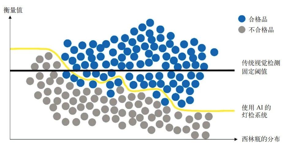 全自动视觉检测系统已问世 30 余年,在标准化检测场景中发挥了重要作用。传统灯检系统通常采用直接的阈值判定方式:工作人员在配置成像系统检测配方时,先识别图像中的色块或形状,再为这些识别结果设定固定数值标准。基于此标准,在合格产品与不合格产品的分布区间划定一条直线作为判定界限。