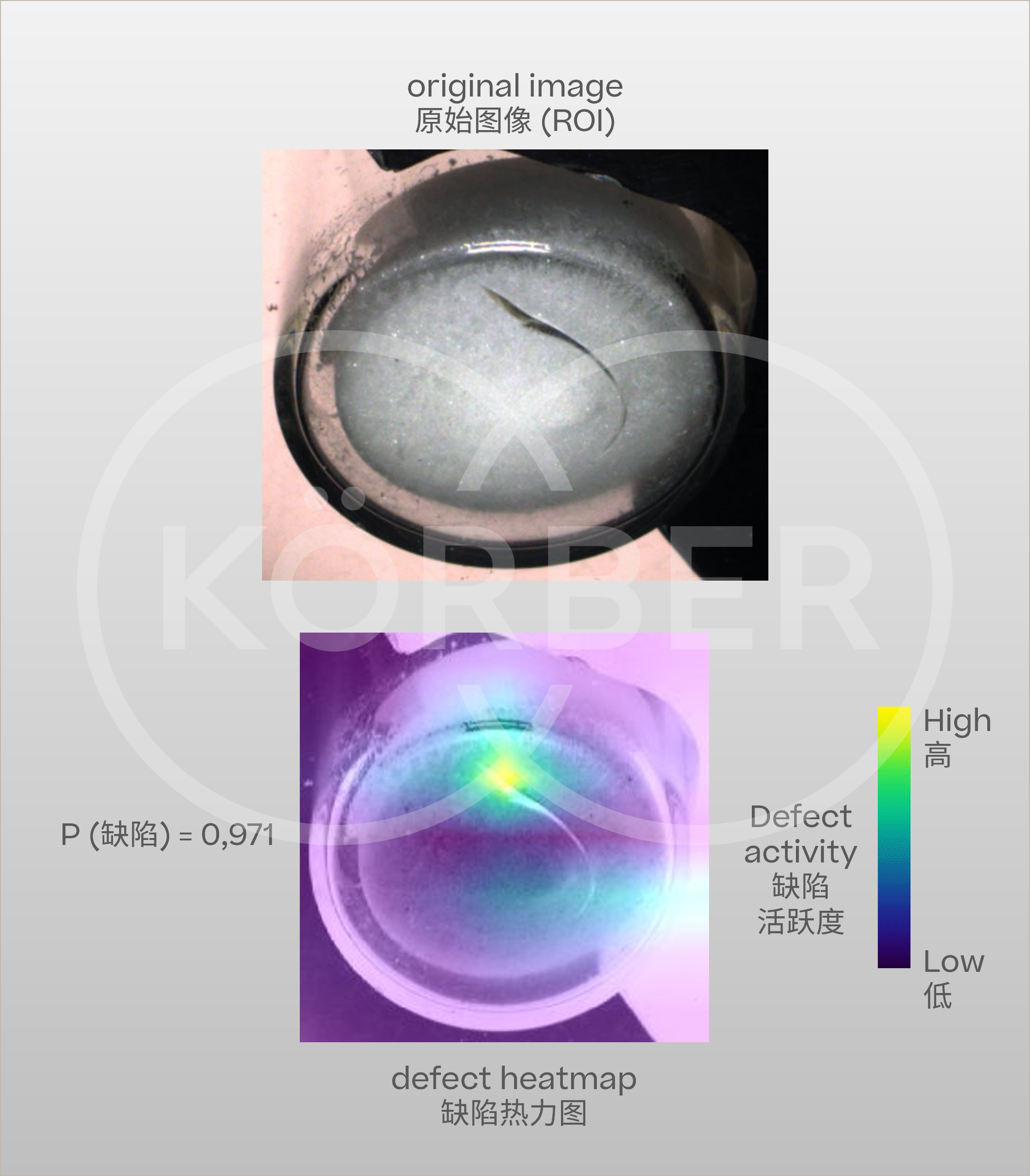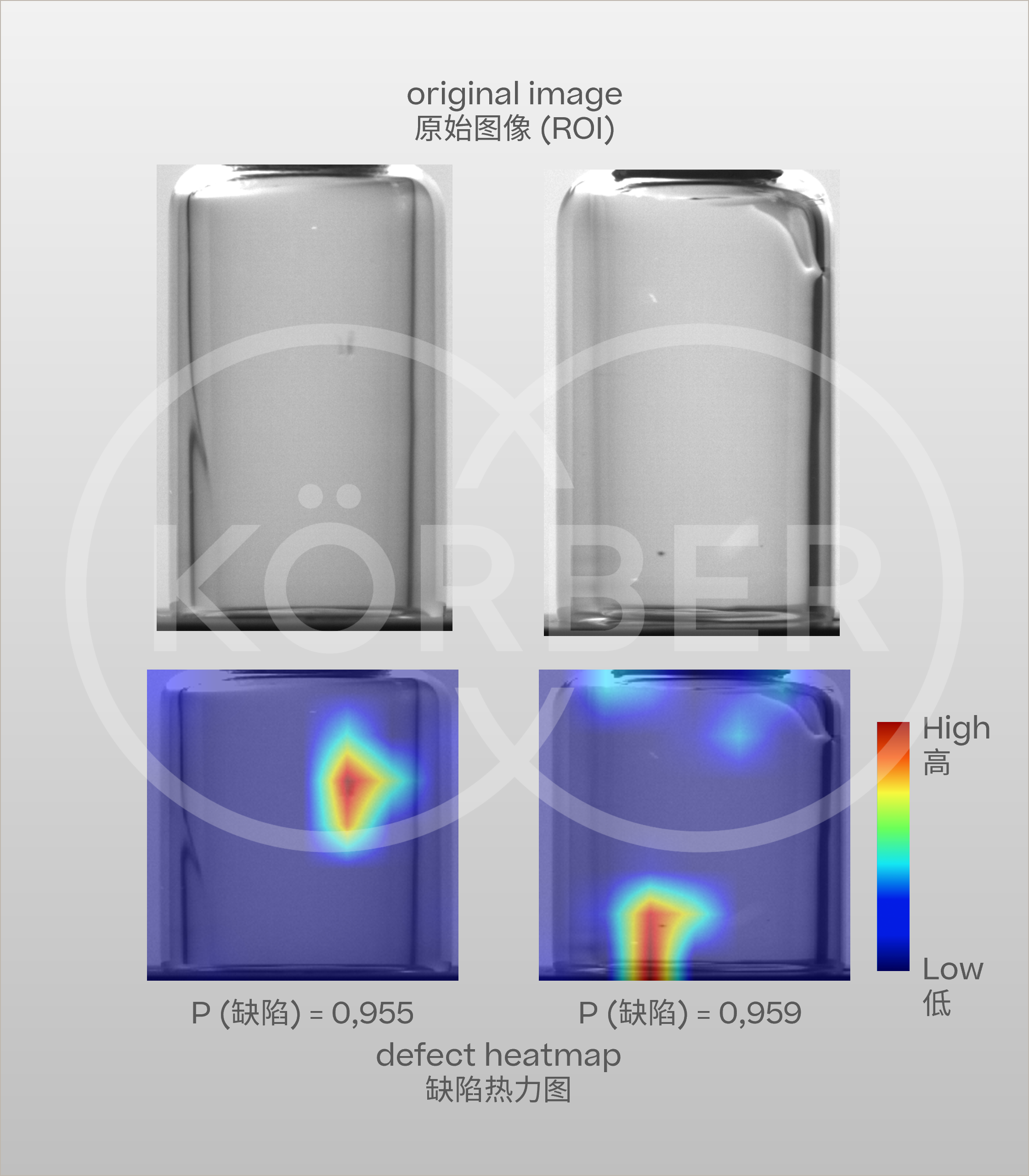在传统计算机视觉检测系统中,无法有效区分上述两种情况,这类样品大概率会被误剔除,以避免发生漏检的风险。而在 AI 检测系统中,通过热力图分析,可精准判断该痕迹为瓶底裂纹的概率(如本案例中概率达 97%),明确为需剔除的缺陷类型(见图 2)。在实际项目中应用此技术后,不仅提升了此类缺陷的检出率,还大幅降低了误剔率,减少了不必要的损失。